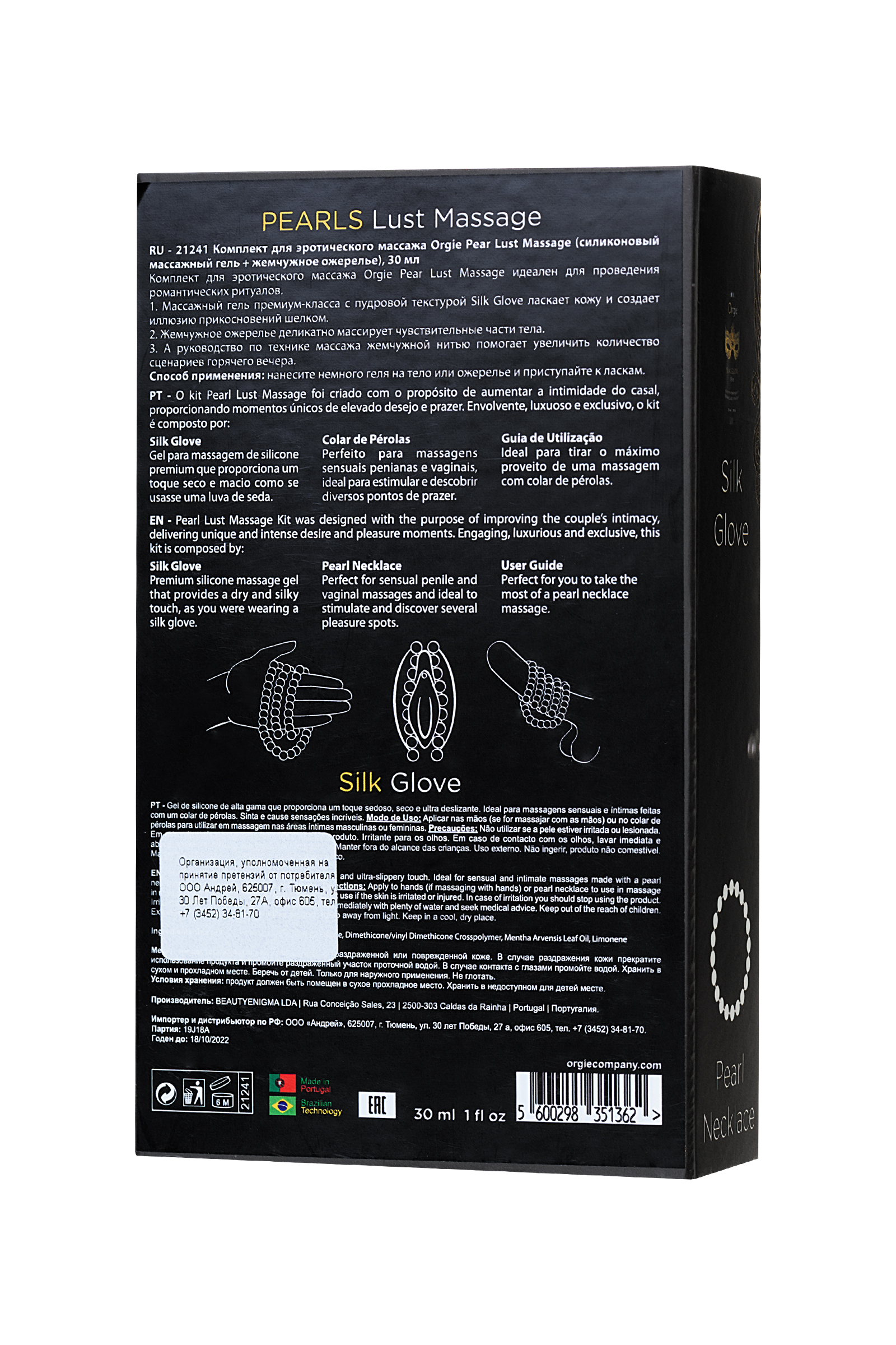 Набор для эротического массажа Орджи Pearl Lust Massage состоит из силиконового массажного геля (30 мл.) и ожерелья из бусинок под жемчуг. С помощью бус, смазанных гелем, можно выполнить чувственный массаж ствола полового члена, сосков или предвагинальной области.