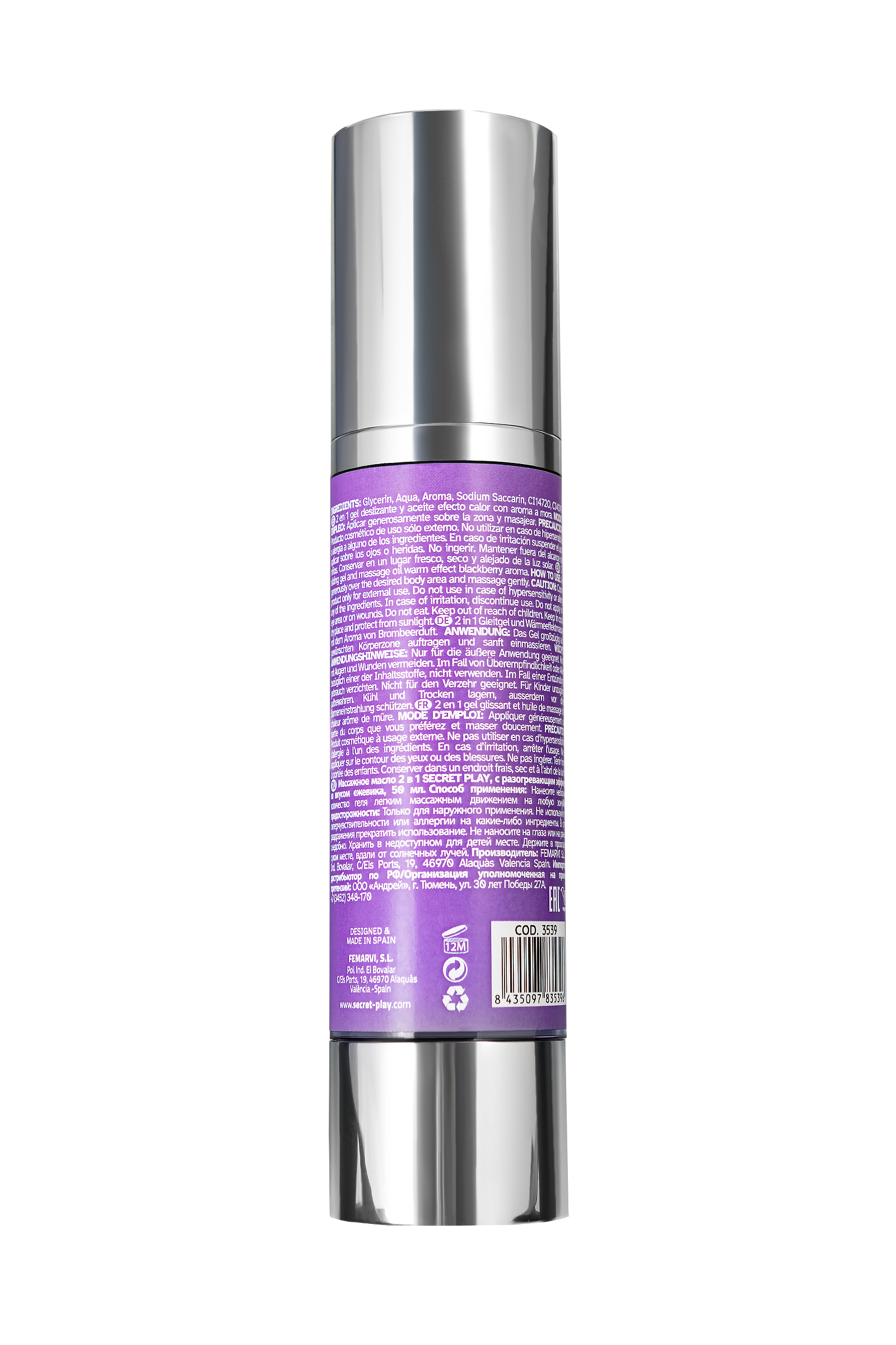 Blackberry Hot Effect — массажное масло 2 в 1 от Secret Play с разогревающим эффектом и насыщенным вкусом ежевики, созданное для тех, кто хочет привнести нотку сладкой чувственности в свои интимные моменты. Это универсальное масло идеально подходит для прелюдий, оральных ласк и чувственного массажа, даря незабываемое тепло и мягкость в каждом прикосновении. Его сладкий, ягодный аромат ежевики окутывает воздух, создавая атмосферу страсти и расслабления, а разогревающий эффект усиливает чувственные ощущения, делая ласки более яркими и глубокими. Масло легко скользит по коже, обеспечивая комфорт и наслаждение, превращая любой момент близости в настоящее удовольствие. Blackberry Hot Effect открывает перед вами мир наслаждений — нанесите его на эрогенные зоны, такие как шея, плечи или соски, и ощутите, как тепло пробуждает чувственность и усиливает удовольствие. Благодаря универсальной глицериновой основе, масло можно использовать как для чувственного массажа, так и в качестве лубриканта для незабываемых прелюдий. Погрузитесь в мир сладкой чувственности с Blackberry Hot Effect и превратите каждый поцелуй и прикосновение в незабываемое удовольствие. Согревающий эффект для более ярких и чувственных ощущений Насыщенный аромат и вкус ежевики, добавляющий страсти к интимным моментам Идеально для массажа, прелюдий и оральных ласк Без сахара, глютена и парабенов, 100% веганский продукт Легкая текстура, без липкости и дискомфорта Глицериновая основа Используется как массажное масло и лубрикант Объем: 50 мл Не совместимо с презервативами и секс-игрушками Безопасно для применения на всех эрогенных зонах Состав: глицерин, вода, ароматизатор, сахарин натрия, карамель. Способ применения: Нанесите масло на выбранные участки тела и нежно помассируйте, чтобы почувствовать мягкое тепло и сладкий вкус ежевики. Идеально подходит для создания расслабляющей и чувственной атмосферы, делая каждый момент близости более страстным и интимным. Меры предосторожности: Не используйте при повышенной чувствительности или аллергии на компоненты Прекратите использование при появлении раздражения Не наносите на область глаз или поврежденную кожу Не глотайте Храните в недоступном для детей месте, вдали от солнечных лучей и влаги