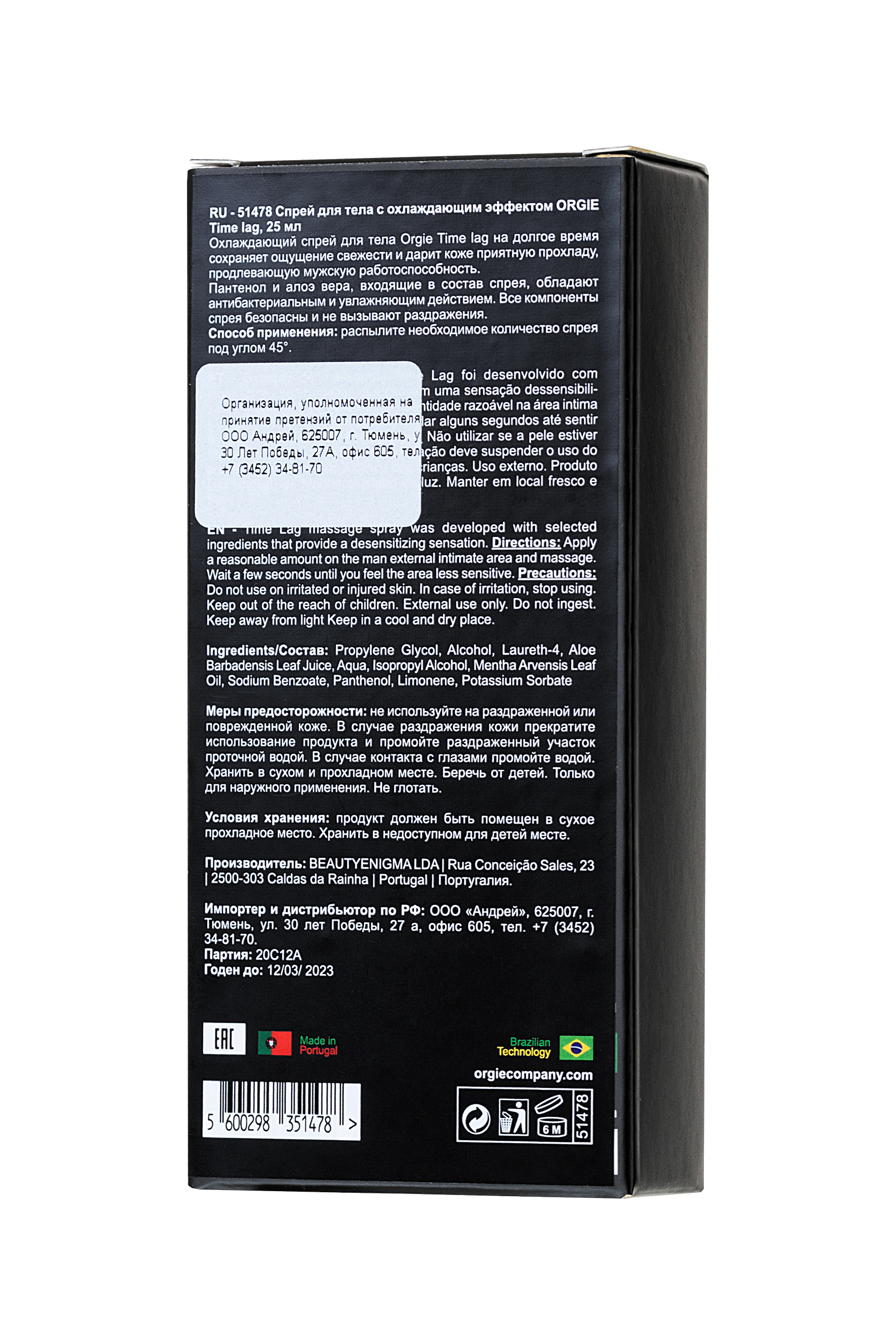 Охлаждающий спрей для тела Орджи Time lag на долгое время сохраняет ощущение свежести и дарит коже приятную прохладу, продлевающую мужскую работоспособность. Пантенол и алоэ вера, входящие в состав спрея, обладают антибактериальным и увлажняющим действием. Все компоненты спрея безопасны и не вызывают раздражения. Способ применения: распылите необходимое количество спрея под углом 45°.
